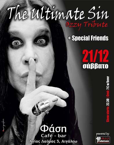 Oι «The Ultimate Sin» είναι η πρώτη Ozzy Osbourne Τribute μπάντα η οποία δουλεύει πάνω σε υλικό τόσο από την προσωπική δισκογραφία του Ozzy Osbourne, όσο και σε επιλεγμένα τραγούδια από τους Black Sabbath.Έτσι στις 21/12 περιμένουν τους φίλους τους στο στέκι τους «Φάση Café» στο Αιγάλεω, για μια βραδιά με πολύ… Οzzy.