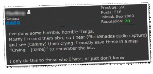 Ψάχνοντας περισσότερο στα αμέτρητα posts αυτών των forums φαίνεται ότι υπάρχουν αρκετοί οι οποίοι απευθύνονται σε αυτό για να ζητήσουν βοήθεια στην προμήθεια και λειτουργία λογισμικού που τους επιτρέπει να ξεκινήσουν την παρακολούθηση (RATting). Ενώ υπάρχουν ορισμένοι που αισθάνονται ελαφρώς ένοχοι για αυτό που κάνουν, η συνταρακτική πλειονότητα δεν βρίσκει κάτι κακό στο να εισβάλλουν στην ιδιωτικότητα των θυμάτων τους και σε ορισμένες περιπτώσεις και κερδίζουν χρήματα από το RATing. Υπάρχουν περιπτώσεις που ένας χρήστης ρωτάει άλλο hackers τη γνώμη του αν αυτό που κάνουν είναι σωστό.