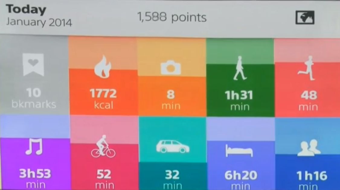 Σήμερα, κράτησα 10 bookmark, έκαψα 1772 θερμίδες, κατέγραψα βίντεο διάρκειας 8 λεπτών, περπάτησα 1 ώρα και 31 λεπτά, έτρεξα 48 λεπτά, άκουγα μουσική επί 3 ώρες και 53 λεπτά, ποδηλατούσα επί 52 λεπτά, οδήγησα περίπου μισή ώρα, κοιμήθηκα 6 ώρες και 20 λεπτά και επικοινώνησα ποικιλοτρόπως επί 1 ώρα και 16 λεπτά. Όλα αυτά ισοδυναμούν με 1.588 «πόντους». Οι λεπτομέρειες που θα προσδώσουν νόημα σε όλες αυτές τις μετρήσεις αναμένονται στην έκθεση Mobile World Congress 2014 τον Μάρτιο στην Βαρκελώνη.