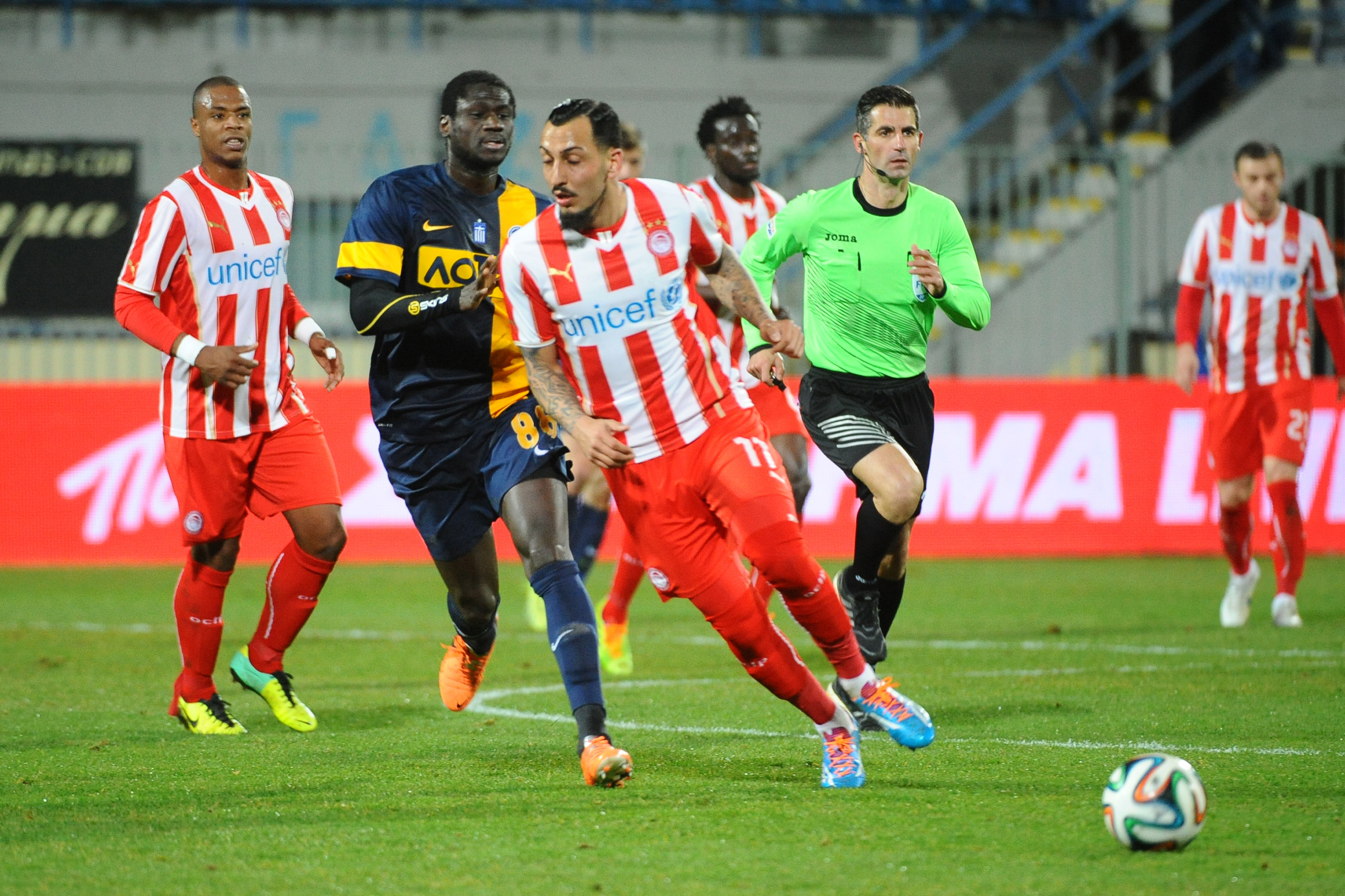 Στο 22΄ ο Μουνάφο βρέθηκε τετ-α-τετ με τον Μέγερι, αλλά δεν κατάφερε να νικήσει τον τερματοφύλακα του Ολυμπιακού. Στο 42΄ ο Ζησόπουλος έστειλε την μπάλα στα δίχτυα των φιλοξενούμενων αλλά ο διαιτητής ακύρωσε το γκολ μετά από υπόδειξη του βοηθού για οφσάιντ.