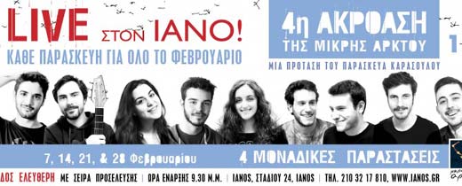 Ο Ιανός φιλοξενεί τους δημιουργούς και ερμηνευτές που ξεχώρισαν στην 4η Ακρόαση της Μικρής Άρκτου, κάθε Παρασκευή για όλο τον Φεβρουάριο.