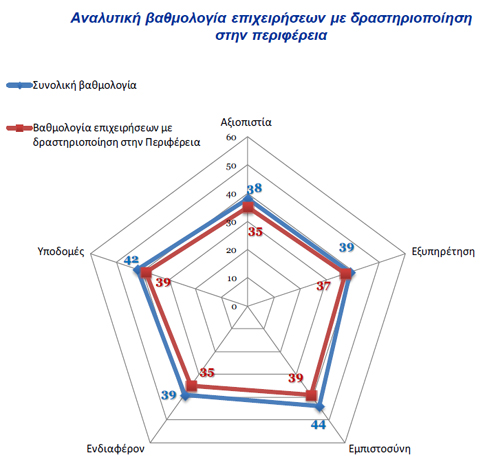 Τα αποτελέσματα ανά γεωγραφική περιοχή δραστηριοποίησης δείχνουν ότι οι επιχειρήσεις που δραστηριοποιούνται στην Περιφέρεια παρουσιάζουν τη χαμηλότερη βαθμολογία. Η χαμηλή βαθμολογία σε όλους τους δείκτες ποιότητας είναι ενδεικτική της χαμηλής ποιότητας υπηρεσιών των περιφερειακών δομών της δημόσιας διοίκησης