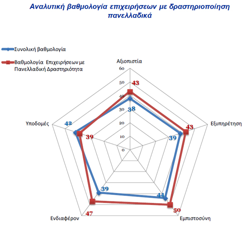 Οι επιχειρήσεις πανελλαδικής εμβέλειας επηρεάζονται λιγότερο από το έλλειμμα ποιότητας της Δημόσιας Διοίκησης, έχοντας υψηλότερη βαθμολογία από το μέσο όρο στην πλειονότητα των διαστάσεων (εκτός υποδομών).