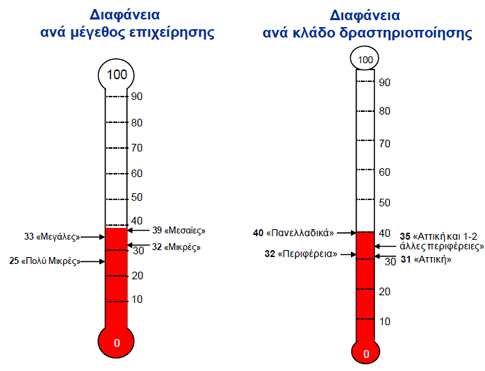 Oι κλάδοι της Μεταποίησης (41), των Υπηρεσιών (40), του Εμπορίου (41), των Ορυχείων (46) της Υγείας (45) και του Τουρισμού (40), που αποτελούν την «κινητήρια δύναμη» της οικονομίας, προσεγγίζουν τη βαθμολογία του συνολικού δείκτη ικανοποίησης. Σε αντίστοιχα επίπεδα βρίσκονται και οι κλάδοι της εκπαίδευσης, της υγείας και των ορυχείων.