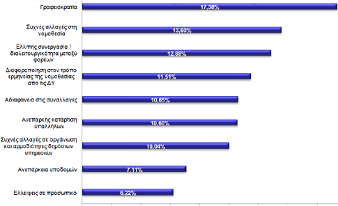 Ακολουθούν οι συχνές αλλαγές στη νομοθεσία (13,60%) και η ελλιπής συνεργασία / διαλειτουργικότητα μεταξύ φορέων (12,88%), η διαφοροποίηση στον τρόπο ερμηνείας της νομοθεσίας (11,51%), η αδιαφάνεια στις συναλλαγές (10,65%), η ανεπαρκής κατάρτιση υπαλλήλων (10,60%) και οι συχνές αλλαγές σε οργάνωση και αρμοδιότητες δημόσιων υπηρεσιών (10,04%).