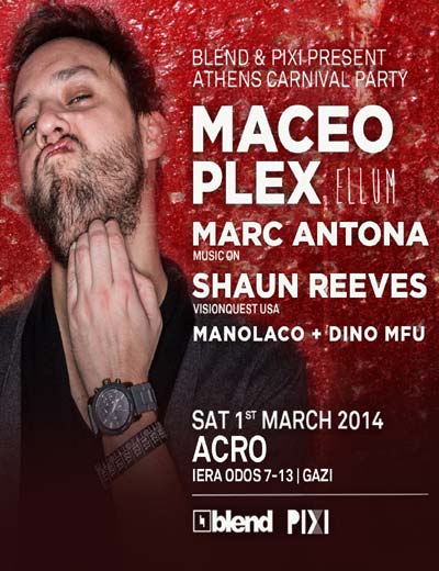 Τρεις ανατρεπτικοί καλλιτέχνες της ηλεκτρονικής σκηνής οι Maceo Plex, Μarc Antona και Shaun Reeves είναι καλεσμένοι της ομάδας Blend και του Pixi που τους υποδέχονται στο Βοτανικό για ένα party σε άκρως αποκριάτικο mood, με δυνατές μουσικές και ανεξάντλητο κέφι. Τη βραδιά θα συμπληρώσει ο resident του Blend, Manolaco και ο Dino MFU.Ο Αμερικανός Maceo Plex, κατά κόσμον Eric Estornel, είναι το «big boss» της Ellum Audio Records και «ο 4ος καλύτερος Dj του κόσμου» σύμφωνα με το Resident Advisor και αποτελεί έναν από τους ευφυέστερους μουσικούς «εγκεφάλους» της παγκόσμιας ηλεκτρονικής σκηνής. Οι φουτουριστικοί tech ήχοι του ως Maetrik, οι εξωπραγματικά ηλεκτρονικοί ως Mariel Ito και τα πρωτοποριακά dark house δείγματά του ως Maceo Plex το επιβεβαιώνουν.