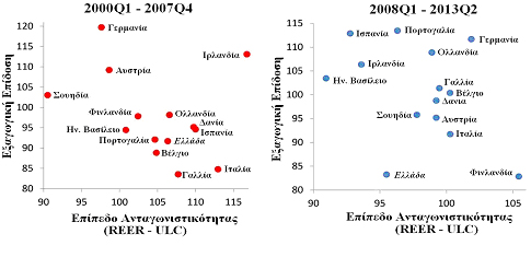 Διάγραμμα 1. Μοναδιαίο κόστος εργασίας και εξαγωγές πριν και μετά το 2008