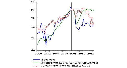 Σημείωση: Το επίπεδο ανταγωνιστικότητας αφορά στο δείκτη Πραγματικής Αποτελεσματικής Συναλλαγματικής Ισοτιμίας με βάση το Μοναδιαίο Κόστος Εργασίας (REER-ULC). Ο δείκτης αυτός μετρά αντίθετα. Όσο αυξάνεται τόσο μειώνεται το επίπεδο ανταγωνιστικότητας και το αντίθετο.