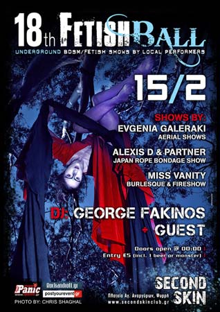 Aerial Shows, Burlesque show, Fireshow αλλά και μουσικές… ανάλογες θα συνθέτουν το 18ο Fetish Ball το οποίο αναμένεται εκρηκτικό.Πιο αναλυτικά, η κορυφαία ελληνίδα Aerial performer Ευγενία Γαλεράκη θα πραγματοποιήσει δυο μοναδικά Aerial Shows, ενώ ο Alexis D (ο άνθρωπος που κρατάει την αξιοπρέπεια της τέχνης του δεσίματος στην Ελλάδα στο σωστό επίπεδο) μαζί με τις παρτενέρ του Cecilia X & Salilia θα παρουσιάσει ένα ολοκαίνουριο σε σύλληψη concept Japan Rope Bondage. Επίσης, η Miss Vanity επιστρέφει τόσο με ένα καινούριο Burlesque show, όσο και το σήμα κατατεθέν Fireshow της.