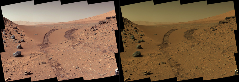 Αριστερά, η εικόνα σε συνθήκες γήινου φωτισμού. Δεξιά, τα πραγματικά αρειανά χρώματα. Κλικ σε κάθε εικόνα για μεγέθυνση (Πηγή: NASA/JPL-Caltech/MSSS)