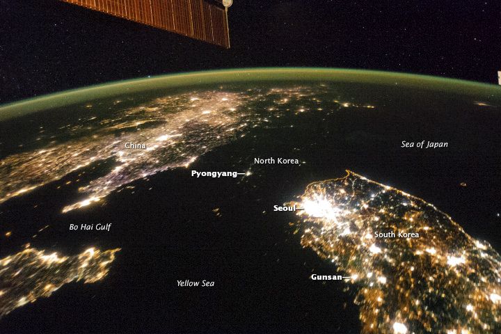 Η υπέρλαμπρη Νότιος Κορέα μοιάζει με νησί σε μια νέα εικόνα από τον Διεθνή Διαστημικό Σταθμό: η Βόρειος Κορέα που τη συνδέει με την ηπειρωτική Ασία μόλις που διακρίνεται τη νύχτα, σκοτεινή σαν τα μαύρα νερά του ωκεανού. Από τα τέλη της δεκαετίας του 1990, όταν τα καύσιμα είχαν πια σταματήσει να ρέουν από τη Σοβιετική Ένωση, η μυστικοπαθής Βόρειος Κορέα αντιμετωπίζει σοβαρή έλλειψη ενέργειας.