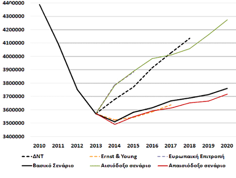 Οι προβλέψεις της Ernst & Young συμφωνούν με αυτές του βασικού και ίσως του απαισιόδοξου σεναρίου (όσον αφορά στην εξέλιξη της απασχόλησης) του μοντέλου μας. Σημειωτέον ότι το βασικό σενάριο αφορά σε ρυθμούς μεγέθυνσης της τάξης του -0,7% το 2014, 2,1% το 2015 και 3,7% το 2016.