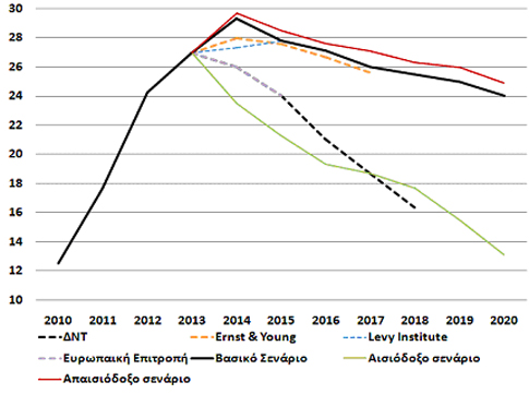 Άρα δημιουργούνται δύο ομάδες προβλέψεων: Οι «σκεπτικιστές» που περιλαμβάνουν την Ernst and Young, το Ινστιτούτο Levy, εμάς (βασικό και απαισιόδοξο σενάριο) και οι «αισιόδοξοι» που περιλαμβάνουν το ΔΝΤ, την Ευρωπαϊκή Επιτροπή και το δικό μας αισιόδοξο σενάριο.
