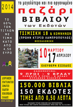 Το Επαγγελματικό Σωματείο Εκδοτών Βιβλιοπωλών Ελλάδος συνεργάζεται ξανά με 150 εκδοτικούς οίκους και προσφέρει στην Θεσσαλονίκη, από τις 10 Μαρτίου έως και τις 17 Απριλίου 2014, βιβλία σε χαμηλές τιμές.