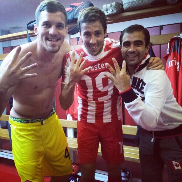 Οι παίκτες του Ολυμπιακού δεν είχαν στο πλευρό τους τους οπαδούς της ομάδας λόγω της τιμωρίας της έδρας, ωστόσο στα αποδυτήρια πανηγύρισαν έξαλλα την κατάκτηση του 41ου πρωταθλήματος. Οι Ερυθρόλευκοι «ανέβασαν» φωτογραφίες στις σελίδες κοινωνικής δικτύωσης με τον Πάουλο Μασάντο να κλέβει για ακόμα μια φορά την παράσταση...