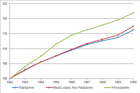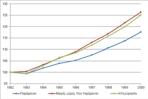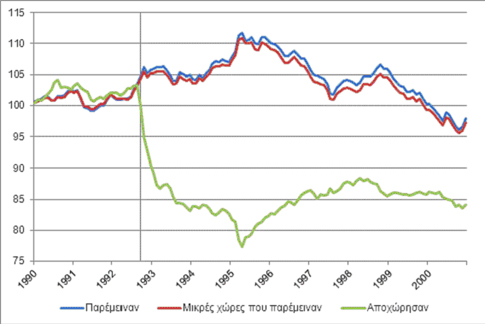 Διάγραμμα 3: Μεταβολής του πραγματικού ΑΕΠ σε χώρες που παρέμειναν στον Ευρωπαϊκό Μηχανισμό Ισοτιμιών (ERM) μετά την κρίση του 1992-1993 και σε όσες αποχώρησαν από αυτόν (100 = 1992).
