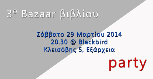 Οι Εκδόσεις Vakxikon.gr διοργανώνουν το 3o παζάρι βιβλίου, το Σάββατο 29 Μαρτίου 2014, στις 20.30, στο cafe-bar Blackbird (Κλεισόβης 5, Εξάρχεια). Follow @ingrBook !function(d,s,id){var js,fjs=d.getElementsByTagName(s)[0];if(!d.getElementById(id)){js=d.createElement(s);js.id=id;js.src=»//platform.twitter.com/widgets.js»;fjs.parentNode.insertBefore(js,fjs);}}(document,»script»,»twitter-wjs»); Όλοι οι τίτλοι των εκδόσεων Vakxikon.gr, από το 2012 έως και σήμερα, θα διατίθενται με έκπτωση από 10 έως και 70%. Το παζάρι θα στηθεί στον πεζόδρομο της Κλεισόβης, ενώ […]