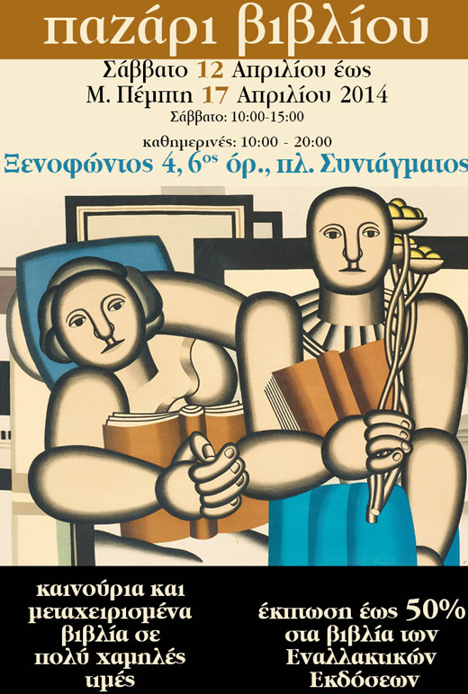 Ο Χώρος Πολιτισμού και Πολιτικής του Άρδην διοργανώνει από το Σάββατο 12 Απριλίου έως και τη Μ. Πέμπτη 17 Απριλίου παζάρι βιβλίου με καινούρια και μεταχειρισμένα βιβλία. Follow @ingrBook !function(d,s,id){var js,fjs=d.getElementsByTagName(s)[0];if(!d.getElementById(id)){js=d.createElement(s);js.id=id;js.src=»//platform.twitter.com/widgets.js»;fjs.parentNode.insertBefore(js,fjs);}}(document,»script»,»twitter-wjs»); Όλα τα βιβλία των Εναλλακτικών Εκδόσεων θα τα βρείτε με έκπτωση έως 50%, αλλά και μεταχειρισμένα βιβλία που θα ξεκινούν από 1 ευρώ. Το […]