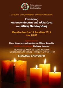 Το Εργαστήρι Ελληνικής Μουσικής του Δήμου Αθηναίων παρουσιάζει έργα του Μίκη Θεοδωράκη Τη Μεγάλη Δευτέρα 14/04 στις 20.00 το Εργαστήρι Ελληνικής Μουσικής θα παρουσιάσει αποσπάσματα από τα έργα του Μίκη Θεοδωράκη «Επιτάφιος», «Επιφάνεια» και «Το τραγούδι του νεκρού αδελφού». Η εκδήλωση διοργανώνεται από τον Οργανισμό Πολιτισμού, Αθλητισμού και Νεολαίας του Δήμου Αθηναίων σε συνεργασία με το Εργαστήρι Ελληνικής Μουσικής, ενώ τα αποσπάσματα θα ερμηνεύσουν οι Τάκης Κωνσταντόπουλος και Μάνος Σκουλάς. Πολυχώρος «Άννα και Μαρία Καλουτά», Τιμοκρέοντος 6Α, Νέος Κόσμος, Τηλέφωνο: 210 9344131 Η είσοδος για το κοινό είναι ελεύθερη