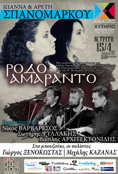 «Ρόδο Αμάραντο» Οι διεθνώς διακεκριμένες μουσικοσυνθέτριες και στιχουργοί Ιωάννα και Αρετή Σπανομάρκου τη Μεγάλη Τρίτη 15/04 θα παρουσιάσουν τη μουσική παράσταση «Ρόδο Αμάραντο» στον Πολυχώρο Χυτήριο. Στην παράσταση θα ερμηνεύσουν έργα μεγάλων ελλήνων δημιουργών όπως των: Μίκη Θεοδωράκη, Μάνου Λοϊζου, Σταύρου Ξαρχάκου, Σταύρου Κουγιουμτζή κ.α. αλλά και έργα από τη δική τους δισκογραφία. Μαζί τους θα είναι ο Γιώργος Ξενοκώστας, και ο Μιχάλης Καζάνας στο μπουζούκι και επιλεγμένοι μουσικοί, ενώ τα κομμάτια θα ερμηνεύσουν οι Σωτήρης Ψυλλάκης, Βασίλης Αρχιτεκτονίδης, και Νίκος Βαρβαρέσος. Ώρα έναρξης 21.00 Πολυχώρος Χυτήριο, Ιερά Οδός 44, Κεραμεικός Τηλέφωνο: 2103412313