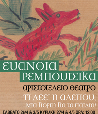 Η Ευανθία Ρεμπούτσικα, μετά την Αθήνα, θα παρουσιάσει την παιδική μουσική παράσταση «Τι λέει η αλεπού;», τα Σάββατα 26/4 & 03/5 και τις Κυριακές 27/4 & 04/5, στις 12.00, στο Αριστοτέλειο Θέατρο στη Θεσσαλονίκη.