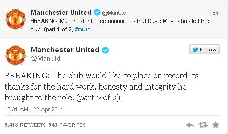 «Η Μαν. Γιουνάιτεντ ανακοινώνει ότι ο Ντέιβιντ Μόγες αποχώρησε από το σύλλογο. Η διοίκηση του συλλόγου θα ήθελε να τον ευχαριστήσει για τη σκληρή δουλειά, την εντιμότητα και την αξιοπρέπεια με την οποία εργάστηκε», αναφέρει η ανακοίνωση των «κόκκινων διαβόλων».