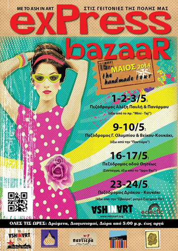 Στα bazaar του Ash In Art που θα συναντήσετε σε διάφορους δρόμους της πρωτεύουσας, θα βρείτε χειροποίητες δημιουργίες, artistic κοσμήματα, αξεσουάρ, καλλυντικά, πρωτότυπα διακοσμητικά και άλλα χρηστικά αντικείμενα, σε χαμηλές τιμές ώστε να είναι προσιτά σε όλους.Επιπλέον, τα «Express Bazaar» θα συμπηρώσουν oι παράλληλες εκδηλώσεις από τα καλλιτεχνικά τμήματα του Ash In Art, ενώ θα γίνεται και συλλογή τροφίμων μακράς διαρκείας για συμπολίτες μας που τα έχουν ανάγκη.