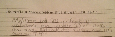 Γράψτε μια ιστορία με ένα μαθηματικό πρόβλημα που να δείχνει: 20 -13= 7. Ο/Η μαθητής/τρια γράφει: «Ο Μάθιου είχε 20 κοπέλες. Δυστυχώς χώρισε με τις 13 από αυτές. Πόσες κοπέλες έμειναν του Μάθιου; Ο Μάθιου έχει επτά κοπέλες».
