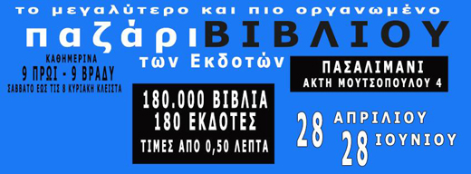Το Επαγγελματικό Σωματείο Εκδοτών – Βιβλιοπωλών Ελλάδος (Ε.Σ.Ε.Β.Ε.) διοργανώνει παζάρι βιβλίου, από 28 Απριλίου έως και 28 Ιουνίου, στο Πασαλιμάνι (Γρ. Λαμπράκη & Ακτή Μουτσοπούλου 4).