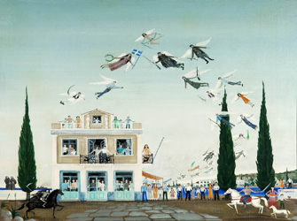 Η ζωγραφική του από αυτήν, ακριβώς, την πολύτιμη ελευθερία ορίζεται. Με παρακαταθήκες από τη λαϊκή παράδοση, ο Ζωγράφος δημιουργεί έναν κόσμο δικό του, στον οποίο πρωταγωνιστούν γοργόνες, νεοκλασικά, σκιάχτρα με τη συμβολική ή τη μεταφυσική τους εκδοχή, καράβια, κατάφορτες πορτοκαλιές, άγγελοι, γυναίκες χιμαιρικές, ο Διγενής, ο πατέρας του και οι ήρωες-άγιοί του, ο Καραγκιόζης και ο Θεόφιλος Χατζημιχαήλ να αιωρούνται σε απόλυτα υπερρεαλιστική διάσταση. Θέματα-φετίχ που επανέρχονται με συγκινητική συνέπεια και στοιχειοθετούν ένα παρηγορητικό σύμπαν από ψηφίδες της ιστορίας, του λαϊκού πολιτισμού, του αρχαίου μύθου, μιας παγανιστικής λατρείας προς τη φύση, όλα από τον μοναδικό οίστρο , την Ελλάδα.