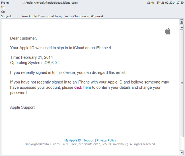Πλαστό μήνυμα ηλεκτρονικού ταχυδρομείου που παροτρύνει τον χρήστη να εισάγει Apple ID και password, με σκοπό την υποκλοπή τους από τον αποστολέα.