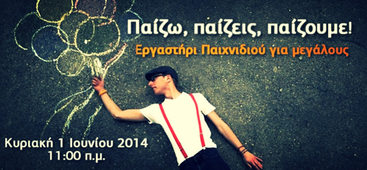 Το Εργαστήρι Ψυχοκινητικής διοργανώνει ένα εργαστήρι παιχνιδιού κατάλληλο για μεγάλους με τον Κυριάκο Μούρτζη, την Κυριακή 1 Ιουνίου 2014, στις 11:00 το πρωί.