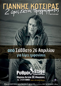 Γιάννης Κότσιρας unplugged Το Σάββατο 17 Μαΐου θα είναι η τελευταία βραδιά του Γιάννη Κότσιρα στη σκηνή του «Ρυθμός Stage» μετά από μια επιτυχημένη σειρά εμφανίσεων από τις 26/04. Στη δίωρη μουσική παράσταση ο αγαπημένος ερμηνευτής θα παρουσιάσει ένα πρόγραμμα που θα είναι γεμάτο από τραγούδια που συνήθως μένουν εκτός προγράμματος αλλά όλοι αγαπάμε να ακούμε και να τραγουδάμε, αλλά και γνωστά παλιά και καινούρια τραγούδια του που έχει αγαπήσει ιδιαίτερα το κοινό. Ρυθμός Stage, Μαρίνου Αντύπα 38, Ηλιούπολη, τηλ.: 210 9750060 Είσοδος: 12 ευρώ με μπύρα ή κρασί – Ώρα έναρξης στις22.30