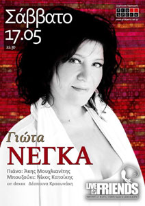 Η Γιώτα Νέγκα live στο Friends Bar Το Friends Bar στο Λαγονήσι υποδέχεται τη Γιώτα Νέγκα σε ένα ιδιαίτερο live το Σάββατο 17 Μαΐου. Η ερμηνεύτρια ξεχώρισε με την εξαιρετική φωνή της ήδη από το πρώτο τραγούδι που ερμήνευσε. Η Γιώτα Νέγκα, μια ολοκληρωμένη τραγουδίστρια η οποία θεωρείται από τις καλύτερες λαϊκές ερμηνεύτριες των τελευταίων ετών, έγινε ευρύτερα γνωστή με το single του Παναγιώτη Καλαντζόπουλου «Με τα μάτια κλειστά» που περιείχε και το ομότιτλο τραγούδι. Το Σάββατο θα βρεθεί στο Λαγονήσι και θα περιμένει το κοινό για μια ξεχωριστή, προσωπική συναυλία. Friends Bar, Λεωφόρος Καλυβίων 21, Λαγονήσι, τηλ.: 22910-26576 Είσοδος ελεύθερη – Ώρα έναρξης στις22.30
