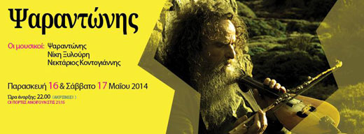 Ο Ψαραντώνης στο Tin Pan Alley Με την επιβλητική του παρουσία στη σκηνή, με τις κραυγές, τους ψιθύρους και τους βρυχηθμούς της λύρας και της φωνής του, καθηλώνει και συνεπαίρνει το κοινό του σε μια θρησκευτική μυσταγωγία, ενώ κάθε live του Ψαραντώνη αποτελεί μια εμπειρία για το θεατή. Για δυο βραδιές, Παρασκευή 16/05 και Σάββατο 17/05 ο χώρος του Tin Pan Alley θα γεμίσει από τους ήχους της λύρας και την ιδιαίτερη ερμηνεία του Ψαραντώνη. Μαζί του θα βρεθούν οι: Νίκη Ξυλούρη και Νεκτάριος Κοντογιάννης. Tin Pan Alley, Τουρναβίτου 6, Πλατεία Ασωμάτων, τηλ.: 210 3210158 Εισιτήρια: 10 ευρώ (όρθιοι), 15 ευρώ (καθήμενοι τραπέζι) – Ώρα έναρξης στις 22.00