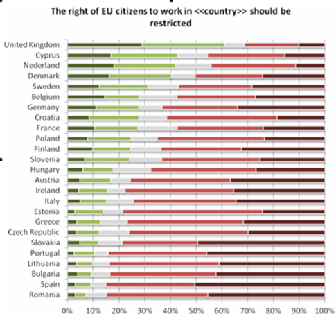 Σε χώρες όπως η Βουλγαρία, η Ρουμανία, η Ισπανία και η Πορτογαλία, τα ποσοστά των χρηστών οι οποίοι αντιτίθενται στους περιορισμούς στην ελεύθερη αγορά εργασίας ξεπερνούν ακόμη και το 80%.