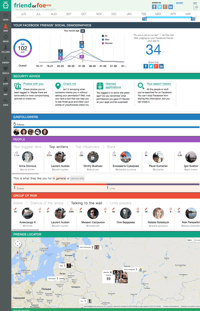Για όσους τους αρέσει να χρησιμοποιούν διάφορες εφαρμογές για να αναλύουν τη δραστηριότητά τους, η Kaspersky Lab δημιούργησε ένα εργαλείο που συλλέγει στατιστικά στοιχεία για τη δραστηριότητά τους στο Facebook. Το FriendOrFoe δείχνει πόσα βίντεο και φωτογραφίες δημοσιεύει ένας χρήστης, πόσα like αποσπά και πολλά ακόμα στατιστικά στοιχεία που ενδιαφέρουν τους λάτρεις του Facebook.
