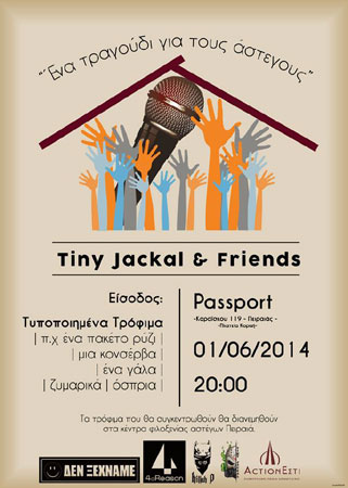 Mια μουσική εκδήλωση αλληλεγγύης και ανθρωπιάς θα φιλοξενήσει την Κυριακή 1/06 η μουσική σκηνή PassPort, όπου ο Tiny Jackal και οι φίλοι του θα τραγουδήσουν για τη στήριξη των αστέγων της περιοχής.