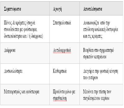 Στον παρακάτω πίνακα, ανάλογα με τα συμπτώματα που αντιμετωπίζετε, υπάρχει μια σειρά ιατρικών σκευασμάτων που μπορεί να είναι χρήσιμα.