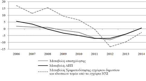 Στο Διάγραμμα 1 φαίνεται ότι η συρρίκνωση της ελληνικής οικονομίας συνοδεύτηκε έστω και με καθυστέρηση από τη μείωση της απασχόλησης, ενώ παράλληλα κινούταν η χρηματοδότηση της οικονομίας. Έτσι, ενώ η μεταβολή του ΑΕΠ μεταξύ 2011 και 2012 είναι σταθερή, η απασχόληση συνεχίζει να μειώνεται το 2012 και ανακάμπτει ένα έτος μετά. Η αρνητική μεταβολή της χρηματοδότησης είναι πολύ μεγαλύτερη το έτος 2012 -σε σχέση με τα άλλα δύο μεγέθη- αλλά μετά το έτος αυτό εμφανίζεται μια αργή ανάκαμψη.