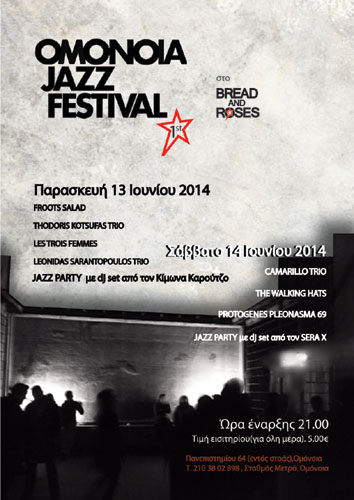 Στον ακάλυπτο χώρο του Bread and Roses, στη στοά της Πανεπιστημίου 64, 29 μουσικοί, 7 μουσικά σχήματα, της σύγχρονης ελληνικής jazz σκηνής για 2 ημέρες θα δώσουν το «παρών» και ατμόσφαιρα… party στην πόλη, την Παρασκευή 13 και το Σάββατο 14 Ιουνίου2014.