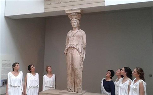 Μαζί με έξι νεαρές γυναίκες ντυμένες στα λευκά ,ως Καρυάτιδες, πραγματοποίησε μια πρωτότυπη διαμαρτυρία έξω από το Βρετανικό Μουσείο, αλλά και μια σύντομη μουσικοθεατρική παράσταση, την Κυριακή, έξω από τον Ορθόδοξο Καθεδρικό Ναό της Αγίας Σοφίας.