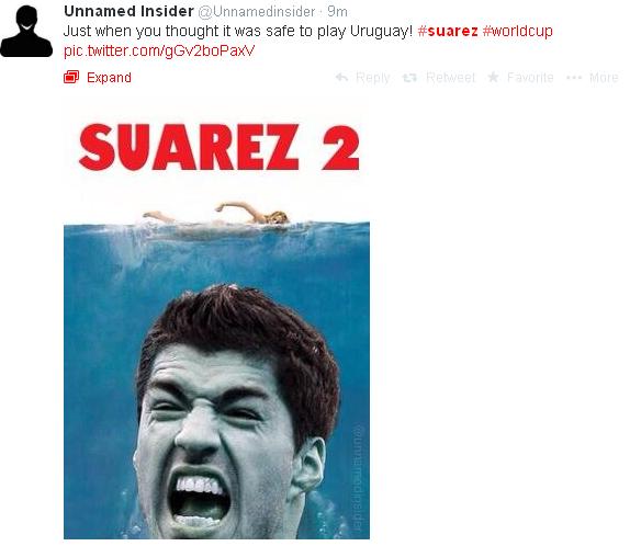 Ο Λουίς Σουάρες κατέφερε να κλέψει την παράσταση στην πρόκριση της Ουρουγουάης κόντρα στην Ιταλία, καθώς όπως φάνηκε ξεκάθαρα και κατά τη διάρκεια του αγώνα αλλά και από τις μετ' έπειτα φωτογραφίες, δάγκωσε τον Κιελίνι σε μία μεταξύ τους διεκδίκηση της μπάλας.
