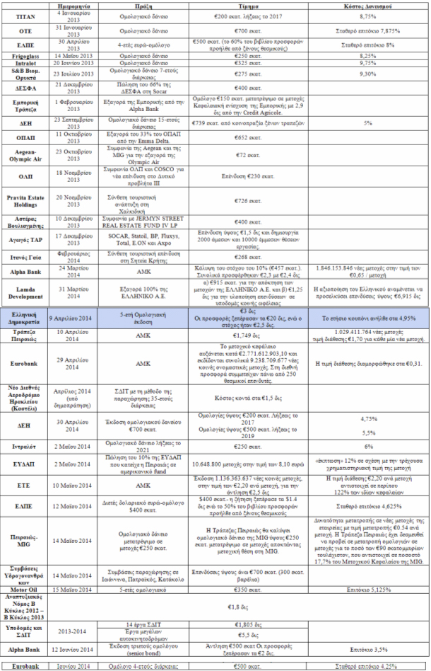 Πτώση του κόστους δανεισμού των ελληνικών ομολόγων και έξοδος της Ελλάδας στις αγορές με επιτυχή άντληση €3 δις με το ετήσιο κουπόνι να ανέρχεται στο 4,95%.