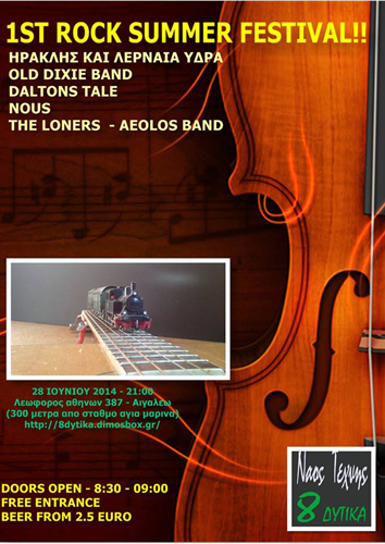 Έτσι το Σάββατο 28 Ιουνίου 2014, ο Πολυχώρος Τέχνης «8 δυτικά» θα πλημμυρίσει με αγαπημένα ροκ ακούσματα, κέφι και πολλές εκπλήξεις – αυτοσχεδιασμούς από τους μουσικούς που θα συμμετέχουν σε αυτή την καλοκαιρινή μουσική γιορτή.