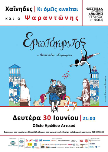 Μια ανάγνωση του Ερωτόκριτου διαφορετική από τις συνηθισμένες προτείνουν οι Χαΐνηδες και η ομάδα Κι όμΩς κινείται (Χριστίνα Σουγιουλτζή, Camilo Bentancor, Ερμής Μαλκότσης) με τη συμμετοχή του Ψαραντώνη, τη Δευτέρα 30 Ιουνίου 2014.