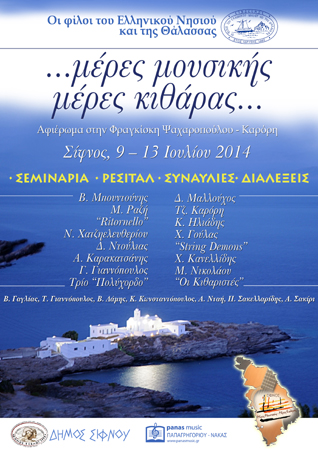 Στο πλαίσιο των εκδηλώσεων «Μέρες Μουσικής» στην Σίφνο θα πραγματοποποιηθεί για πρώτη φορά το Πανελλήνιο Σεμινάριο Kιθάραςαπό τις 9 έως τις 13 Ιουλιου 2014.