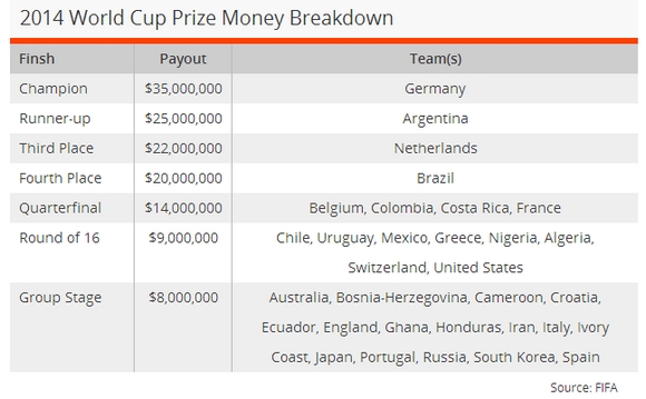 Όπως είναι λογικό, το μεγαλύτερο ποσοστό θα λάβει η παγκόσμια πρωταθλήτρια Γερμανία, αφού η ομοσπονδία της χώρας θα βάλει στα ταμεία της 35 εκατομμύρια δολάρια. Ενώ η φιναλίστ, Αργεντινή, θα γίνει πλουσιότερη κατά 25 εκατομμύρια.