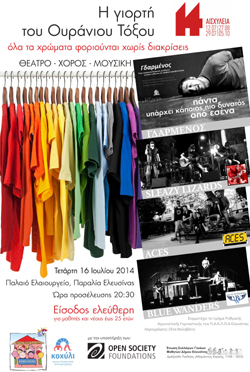 Το Κέντρο Αγάπης Ελευσίνας πραγματοποιεί μια γιορτή που ενώνει τη φωνή των νέων ενάντια στις διακρίσεις, στο θέατρο του Παλαιού Ελαιουργείου στην Ελευσίνα, την Τετάρτη 16 Ιουλίου 2014 στις 20:30. Η «Γιορτή του Ουράνιου Τόξου» πραγματοποιείται στο πλαίσιο του Προγράμματος «Φτιάχνουμε μαζί το Ουράνιο Τόξο» που έχει ως κεντρικό στόχο την ευαισθητοποίηση των νέων κατά […]