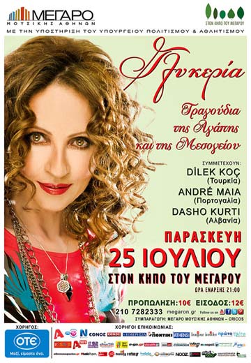 Την Παρασκευή 25 Ιουλίου η μεγάλη ελληνίδα ερμηνεύτρια με συνοδοιπόρους τους: Ντιλέκ Κοτς, Αντρέ Μάια και ΝτάσοΚούρτι θα μας «ταξιδέψουν» από τον Κήπο του Μεγάρου στη Μεσόγειο με «Τραγούδια της αγάπης και της Μεσογείου».